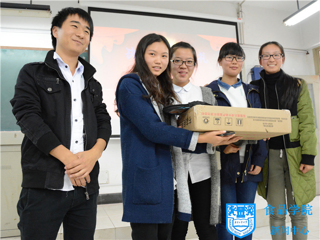 20151101 颁奖典礼上校勤工办主任袁凯为一等奖获得者进行颁奖,并与其合影。 (食品院)
