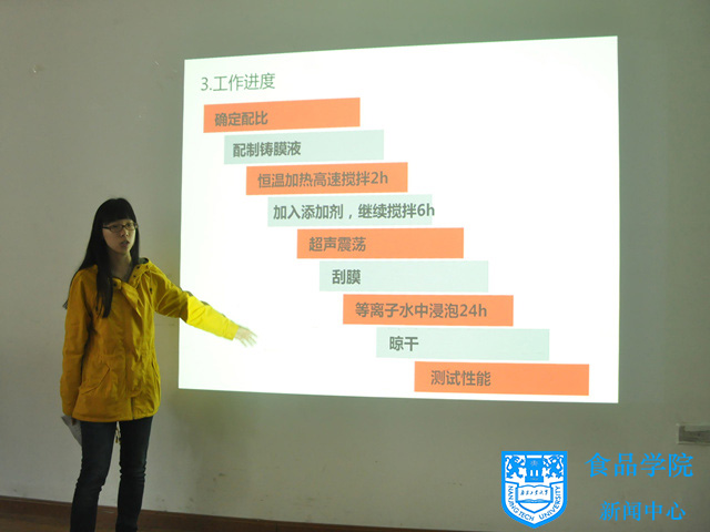 4月21日下午1:30,食品院“大学生创新与实验开放基金”中期成果展示活动在生工A2-208成功举办。食品院分团委书记权良媛老师、食品院轻化工程系主任郑春玲老师和食品科学与工程系主任陆利霞老师参与本次活动并担任评委。