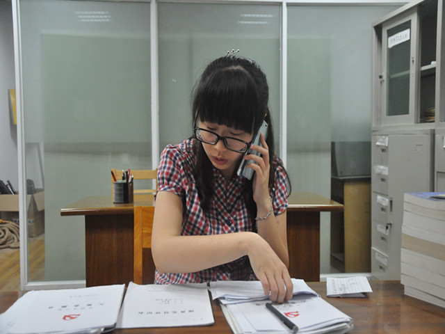 20130526 党员值班室,本科生第一党支部书记刘敏娴同志一边打电话统计积极分子信息,一边整理着入党志愿书(食品学院)