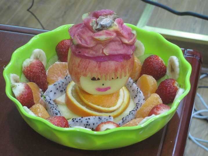 食品系系主任陆利霞教授为本次活动致开幕词。开幕式活动由多个环节组成。第一环节为“一字长蛇阵”,每组派四名选手参赛。第一个人看屏幕上的四字成语后,用肢体语言向前一名队员表现出来,依次传到最后一人,由最后一人说出成语。在这一环节中,队员们滑稽搞笑的动作惹得现场观众捧腹大笑,掌声、欢笑声经久不息。在表演成语“回眸一笑”时,一位男生把两手放在眼睛前面,眯着眼睛,不停地眨动一双眼睛,表演得有趣而生动,他的队友却给出了“眉目传情”这个答案,令所有在场观众忍俊不禁地笑起来。此环节重在考验大家的默契程度,第二环节 “知识达人”则充分考查选手们食品相关知识的掌握程度。食品安全,食品营养搭配,食品保鲜、保存等题目层出不穷。前来参赛的大多是食品专业的学生,回答起来相当得心应手,精彩的表现得到了老师们的高度赞扬。经过紧张激烈的知识问答后,充满创意的“水果秀一秀”环节,又一次将活动推向了高潮。可爱的娃娃脸、翩翩起舞的五彩蝶、娇艳的牡丹、素雅的百合、多彩的海底世界等精美的拼盘一一呈现眼前时,让人怀疑眼前所看到的是否真的是水果。同学们精彩的作品讲解更是让在场的观众豁然开朗。南京农业大学代表队所做的“时钟拼盘”指针指向八点,喻意着当代大学生要像八点的阳光那样朝气蓬勃,期待着辉煌。南京师范大学代表队的“蝶恋花”则代表着青年学生要像花朵那样充满活力、充满激情。南京林业大学作品“灿烂的笑脸”充分展现出了对多彩开心的生活的向往,生活中不缺美,因而我们要善于发现美。