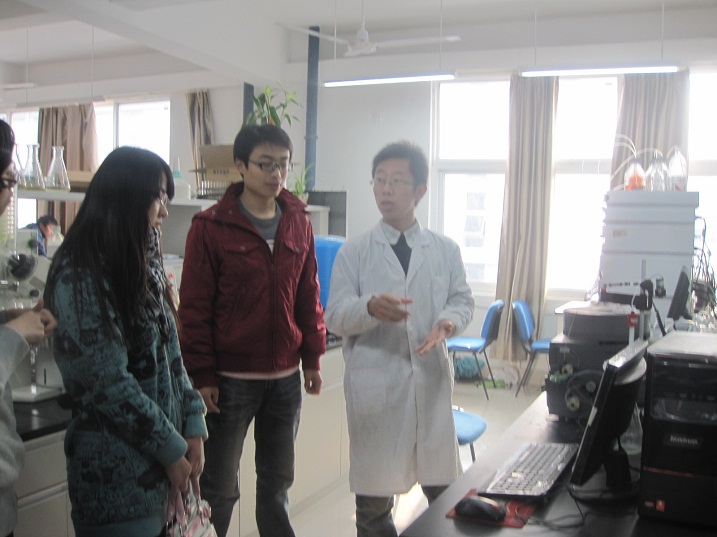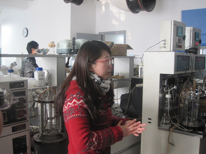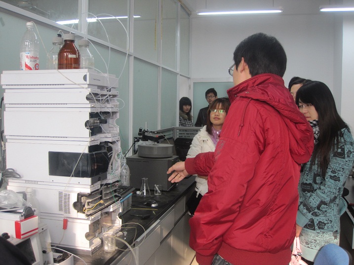 上午九点,同学们在学生会工作人员的带领下,参观了我院院长徐虹教授实验室。走进实验室,同学们看到了许多之前从未接触过的实验器材:培养细菌的摇瓶、恒温培养箱、检测物质含量的液相色谱仪、纯水仪、真空抽滤泵、灭菌锅、离心机、测糖仪等国内外先进仪器,这些让同学们大饱眼福。“咦,那是什么?”有同学指着一个大玻璃罐,好奇地问道。实验室的学姐热情地为大家作解释:“那是发酵罐,用做细菌的培养与发酵。培养的细菌可以分泌一种酶,可用于合成木糖醇等物质……”同学们听地津津有味,时而深思,时而会心一笑。听完学姐的介绍,同学们还意犹未尽,就学科发展方面许多问题向实验室博士发问,同学长学姐进行了更深入地交流,整个实验室热闹非凡。