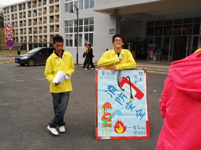 活动时间定在11月9日中午12点10分,地点为人流量较大的东苑,西苑,新南苑食堂,活动过程中我班学生发放宣传单,张贴海报。并向同学们宣传火灾预防知识,以及拉横幅提醒大家注意消防安全。中午的活动重在宣传。下午跟保卫处老师的活动重在演习。在下午3:10新南苑篮球场的空地上,班长首先强调了消防安全知识的重要性,接着,保卫处老师讲解了消防安全一些小常识以及案例。团支书在现场向观众提问消防安全知识,答对赠送小礼品。最后,保卫处老师教大家如何正确使用灭火器。在场的所以同学在老师的指导下都演习了一遍。