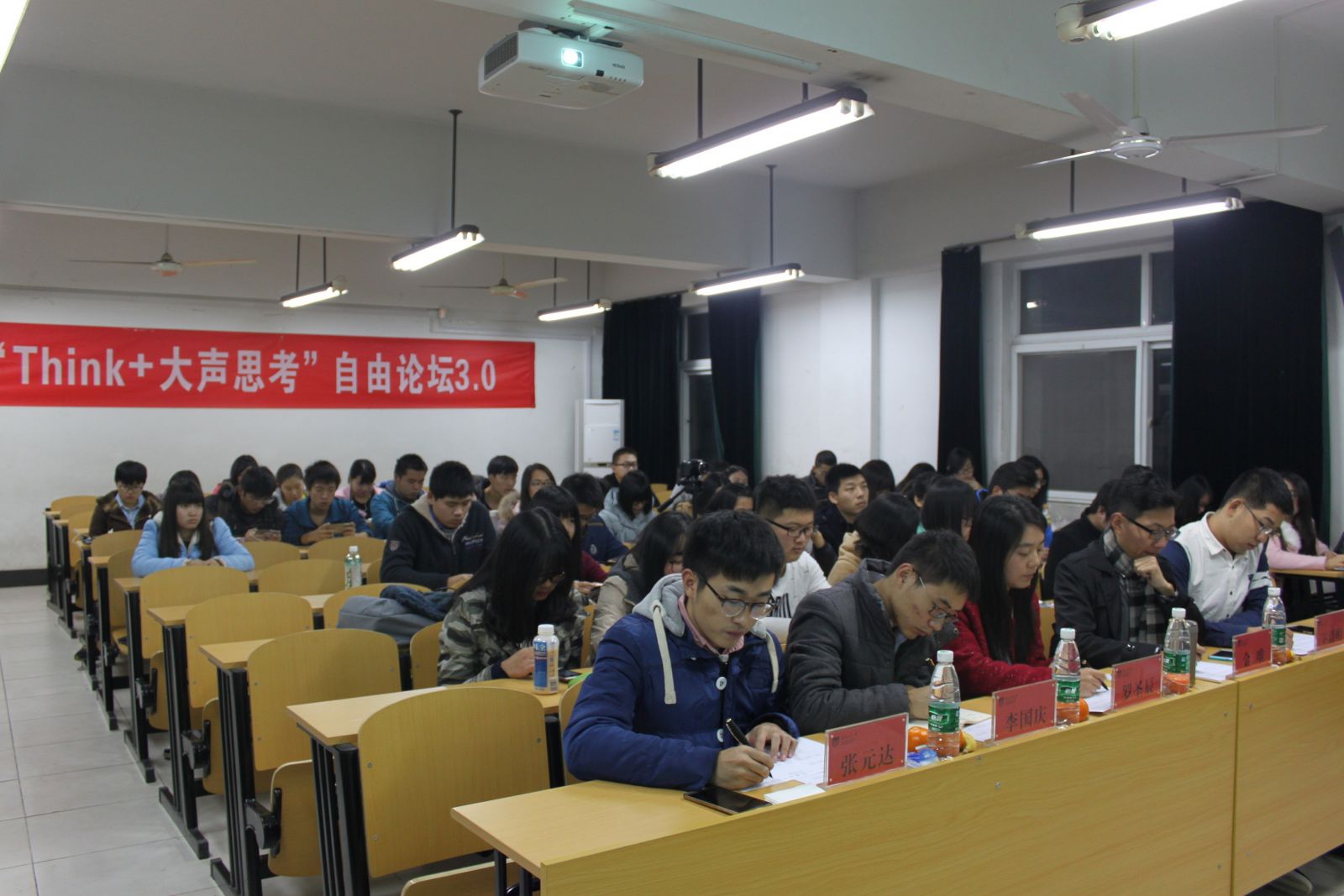 把思想搬上舞台,让每一个思考者都有广阔的发声平台,让每一种不同的思维正面交锋,这就是think+的意义。2015年12月11日晚六点,由经济与管理学院学生联合会主办的第三届“think+大声思考”自由论坛决赛于厚学楼206教室成功举办。担任此次比赛的评委有经济与管理学院辅导员罗圣辰老师、经济与管理学院学生联合会主席金唯、2011学院学生会主席李国庆、交通运输工程学院学生会主席王清明和艺术设计学院学生会主席张元达。