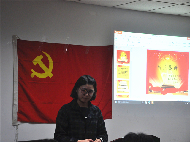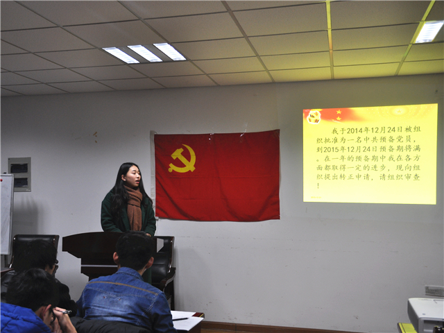 会议在严肃紧张的气氛下进行,四位同志依次对其预备期间的思想、学习、工作、生活等各方面的情况进行了汇报。姜晗昕同志很详细的在PPT上展示了自己一年前与现在各方面的对比,让与会党员了解到她本人在一年间的变化与进步。王俊雅同志PPT内容虽简而又少,但通过详细的口头叙述同样全面的向组织交待了自己预备期间的各方面情况。戴天婷同志就习近平总书记对非洲国家进行国事访问这一问题发表了自己独特的见解,而李丹丹同志则针对美国社交网站“脸书”首席执行官扎克伯克捐献99%股份做慈善这一举动深入分析,理论联系实际,真正起到了模范带头作用。