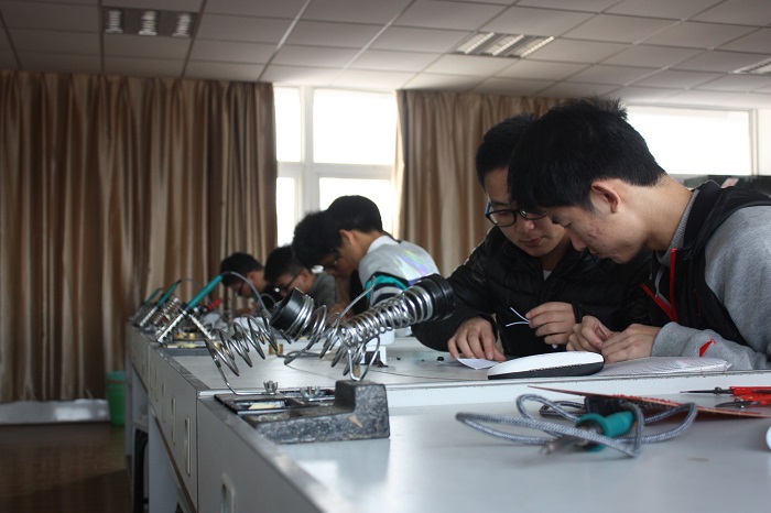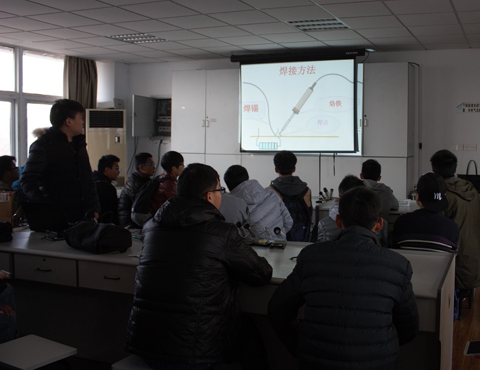 为了让大家熟悉焊接的操作,赛前科协副部长吉晓祥先对每一位选手进行了培训,介绍操作流程及技巧。随后,比赛正式开始。比赛过程紧张激烈,在规定的时间内,参赛选手需使用举办方提供的电烙铁及其他所需的器件,将器件焊接在电路板上,以实现该电路的功能。在持续一个多小时的比赛过程中,选手们都埋头认真操作,大部分都完成了自己的作品。这场比赛不仅仅是在考验选手的个人动手能力和细心程度,还考验两位选手之间的合作和默契。最终,荆岳、黎丽梅两名同学荣获了一等奖,张旭照、刘淑雯等四名同学获得了二等奖,白杰、丁宁等八名同学获得了三等奖。