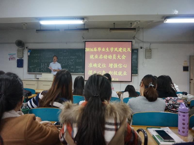 会议开始,徐老师就近年就业工作的具体事项进行了解读,并详细的介绍了近几届本科生毕业后的就业区域,就业率等,引导同学们树立正确的就业方向和就业观。徐老师还结合今年目前同学们的就业情况提出几点建议,第一,虽然已经大四,专业课程比较少,但同学们必须坚持到课,上课与就业并不冲突,学风建设不能放松;第二,省内的同学在寒假之前最好落实工作问题,外省的同学利用寒假时间,尽量在寒假结束后解决就业问题;最后,徐老师还就考研同学的就业问题加以指导。会议下半场张琪教授发表讲话,张教授强调,一是抓学风,希望同学们将时间精力放在学习上,多读书读好书,不仅要学习专业知识技能,还要掌握学习方法。向书本学,向师长学,向身边的同学学;二是要尽早准备就业,做好就业的充足准备。她强调了找工作的各项注意事宜,并结合前几届毕业生有在签约过程中存在的问题,作了解释和说明,告诉学生一定要保持积极、乐观、踏实、认真的态度,多思考多总结,不断努力和进取,积极准备就业。对于大四同学而言,有几个时间点必须牢牢抓住,校园的招聘会切不可错过。尽可能快速,稳定地解决好工作问题。现场时不时地爆发出一阵阵热烈的掌声,同学生以此感谢老师的谆谆教诲。