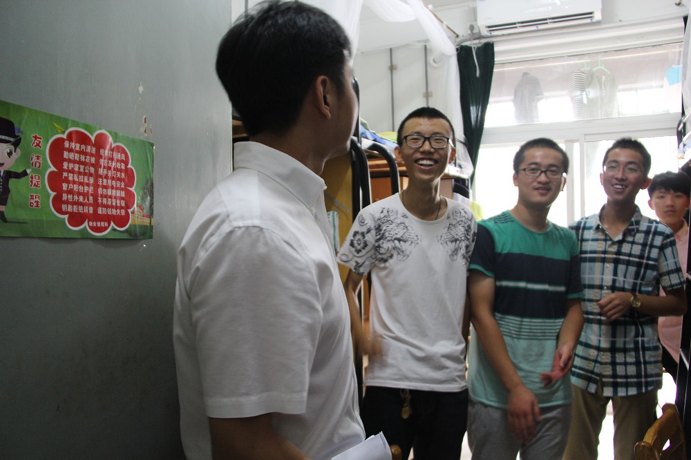 生工学院领导老师一行走访了每间新生宿舍,细心察看宿舍设施的各个环节,详细了解同学们的个人情况,亲切询问同学们对南京饮食和学校的住宿环境等是否适应,热情的向随行家长们介绍学校的环境和管理情况,让他们对孩子的学习和生活放心。特别强调了安全问题,提醒新生同学们提高警惕、谨防上当受骗;对于同学们反映的一些问题,表示一定会在第一时间帮助解决;鼓励新生们尽快适应大学生活,协调好同学关系,共同打造和谐宿舍。