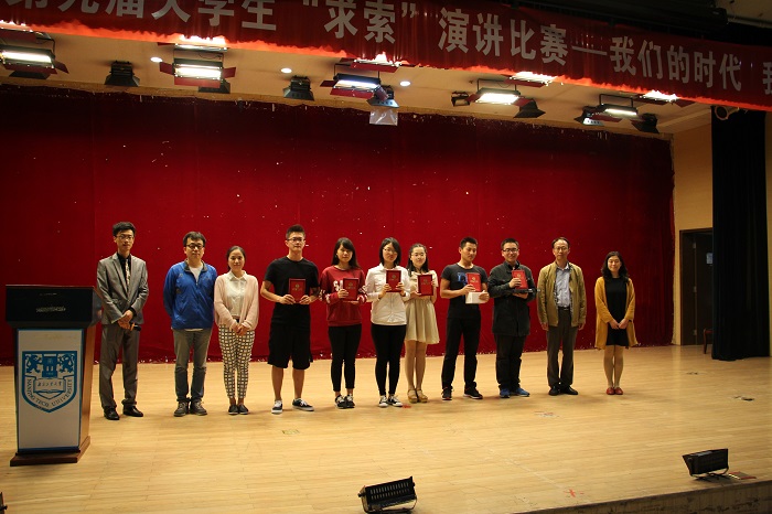 每位进入决赛的选手都展现出了他们卓越的口才及演讲能力,强大而又内敛的气场遍布了整个报告厅。在此次比赛中,一等奖获得者严立同学就读书论展开了个人对于此次演讲主题的认知,得到了评委和观众的一致认可。三等奖获得者汤沂萱同学以川师大血案为引,举例说明我们应在当今时代里做一个有良知的大学生。而吴宁翔同学则从自我的“担当和对他人的担当两个方面阐述。对自己,要敢作敢当,不对事情拈轻怕重,斤斤计较;对他人,要成为可以他人信任的人,同时信任并理解他人。比赛最后,唐明辉书记也上台发表了自己的看法。书记阐述个个人对于比赛主题的理解,以及为什么要举办“求索”讲坛。时代需要我们,我们也在时代中发展并为之奋斗。大时代中的大担当,尤为可贵。疾风然后知劲草,盘根错节然后识利器。担当的艰难,担当的伟岸,集中体现于我们的时代。在人的一生,大学是我们心中最为重要的一个地方,在这里我们有一个新的起点。在这里,我们放飞青春,我们畅说理想,不管是老生还是刚刚踏入大学的新生,都有着自己的憧憬与向往,有着自己的梦想。当梦想与现实碰撞,现实被照亮,梦想最终也将回归现实,如何在我们的时代里担当,这是需要我们思考的。
