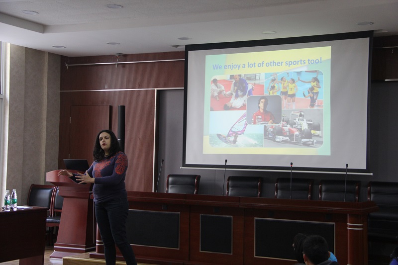 交流会上,巴西留学生比洋卡先是和大家分享了巴西的足球、排球、赛车以及柔道文化,其中最让同学们着迷的就是巴西足球:足球是巴西人文化生活的主流,巴西是世界上名符其实的足球王国,也是迄今为止唯一一个五度捧起世界杯冠军的国家; 巴西人人都是球迷,足球作为“大众运动”,既是运动,更是文化,巴西人笑称“不会足球、不懂足球的人是当不上巴西总统的,也得不到高支持率”。之后一系列的趣味游戏活动更是带动了全场的气氛,在一片欢声笑语中也让巴西友人体会到中国文化的博大精深。