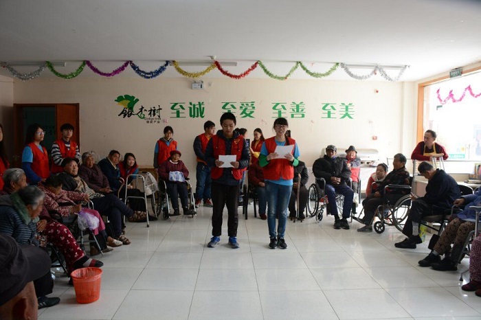 早晨8:10,志愿者们在校门口准时集合,乘坐公交车前往银杏树敬老院。到达敬老院后,志愿者们两两一组,与老人们谈心聊天,敬老院顿时热闹起来。随后同学们还给敬老院的老人们表演了精心准备的节目。首先是女生合唱《外婆的澎湖湾》,歌声婉转动人、沁人心肺。接着由志愿者又给老人带来诗歌朗诵《为你写诗》,他们以饱含深情的朗诵赞美老人们的奉献与付出。随后的名曲合唱《茉莉花》引起了当天的小高潮,在场的老人、志愿者以及工作人员纷纷跟着旋律哼唱起来,现场一片其乐融融的景象。志愿者们还给老人们表演了舞蹈,并且设计了猜字谜、做手指操等独具创意的活动。表演结束后,志愿者们协助工作人员打扫现场并和老人们告别,无不感慨万千。