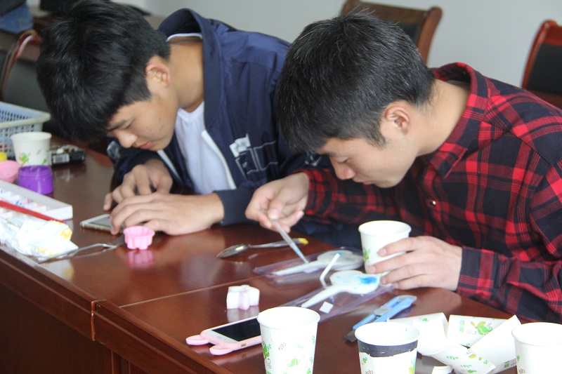 活动开始,在工作人员溶解皂基的同时,参赛选手们发挥奇思妙想,利用彩色卡纸和颜料为自己的手工皂设计制作精美实用的皂盒。皂基溶解后,选手们开始手工皂制作。制皂过程需要选手们的精准计算和严谨操作以及小组成员间的默契配合。经过一个多小时的努力,15组选手都完成了自己的作品,接受两位评委老师的打分。评委们根据手工皂的造型、色泽、气味、纯净度以及皂盒的设计等方面对各组选手的作品进行了评分。接着选手们对其他选手的作品进行了互评。选手们的作品各具特色,难分高下。最后两位老师为总分最高的三组选手颁发了精美奖品。