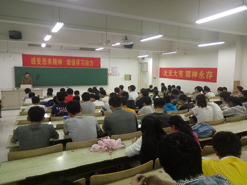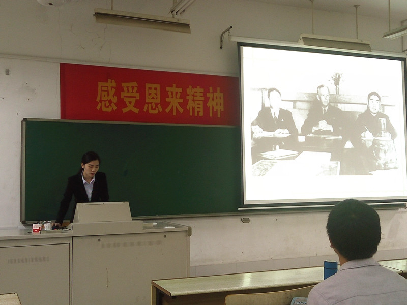活动开始,由熊中宏副书记为活动致词。熊书记围绕大学生的现状,循循善诱,从“大学”的定义出发,要求同学们大学期间要树立自己的标杆,有目标、有动力、有境界,有视 野,不功利、不浮躁,把握好学校所给的自由度,真实地利用好空余时间,不仅是在学习上,更要在生活上,思想上,做一个合格的大学生,度过一个充实的大学生活。接着,吴老师通过ppt,从三个方面图文并茂地上了一堂生动的党课。第一,给同学展示了梅园新村的一些标志性建筑、革命旧址,每个建筑都有一些有关周总理的小故事,而这每个故事都在诠释着恩来精神----积极进取、艰苦奋斗、求真务实、勇于创新、严于律己、甘为公仆。第二,绘声绘色地给同学们再现了当年国共南京谈判的历史画面,让同学们更为深入细致的了解了当时发生的历史事件及事件前后的因果关系等,从而加深了对当时国情的理解,激发了他们对如今美好生活的珍惜之情。第三,通过一段段相关人物采访视频,由革命老前辈们口中,她让同学们更全面地了解当时周恩来学习、工作及生活的各个方面,立体的感受到了周恩来的人格魅力。