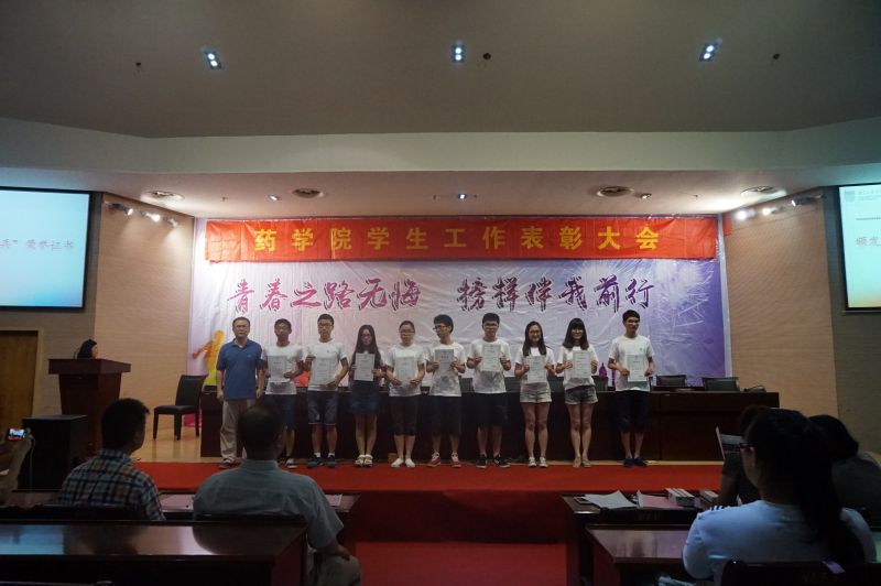 为展现我院毕业班学子的青春风采并表彰2015~2016学年度对我院学风建设有突出贡献的个人,给我院在校生树立榜样,2016年6月21日下午,药学院在图书馆一楼报告厅成功举办“青春之路无悔,榜样伴我前行”学风建设表彰大会。
