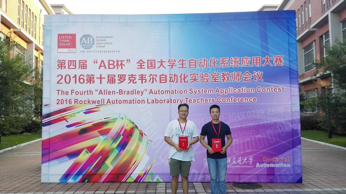 第四届“AB杯”全国大学生自动化系统应用大赛全国总决赛于2016年7月31日在上海交通大学举行,大赛吸引了全国300多所高校参加,其中56所高校经初赛选拔进入总决赛。电气工程与控制科学学院控研14级刘成龙同学、电气工程及自动化专业13级赖鄹同学组成的参赛队在总决赛中力克众多强手,获得了总决赛一等奖的优异成绩。