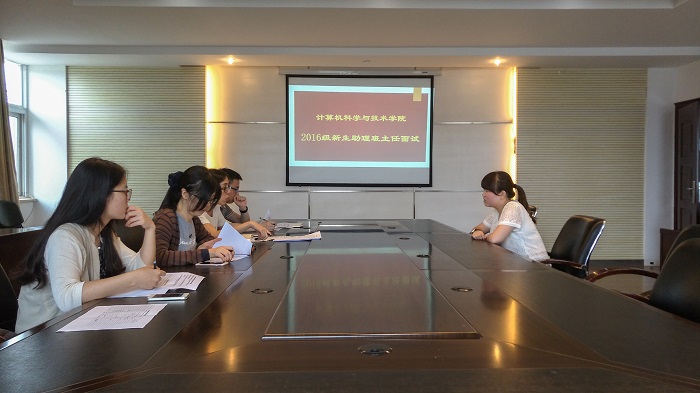 随着计算机科学与技术学院2016级新生的即将到来,我院新生助理班主任的招募工作已陆续开展。最终,18位各方面表现突出的同学经过激烈的角逐进入到最后的面试环节。6月30日,我院在学院604会议室举行最后面试。院党委副书记郑娟老师,院团委副书记吴超老师、季君老师,2014级辅导员郭健明老师担任此次面试评委。