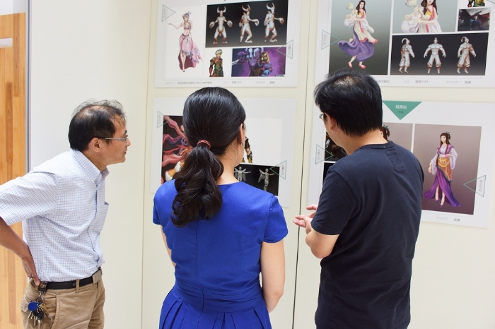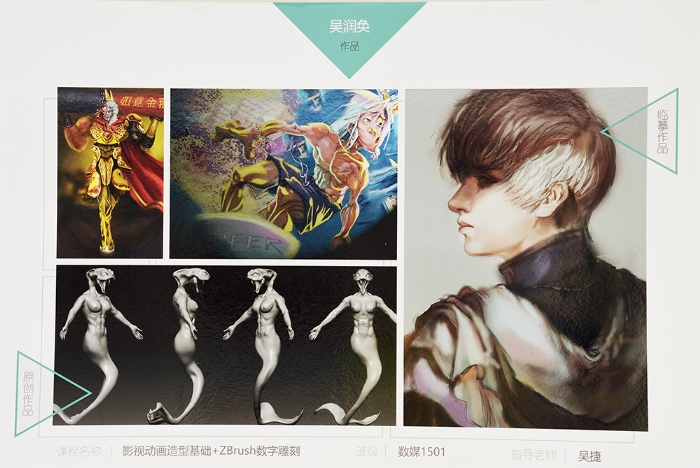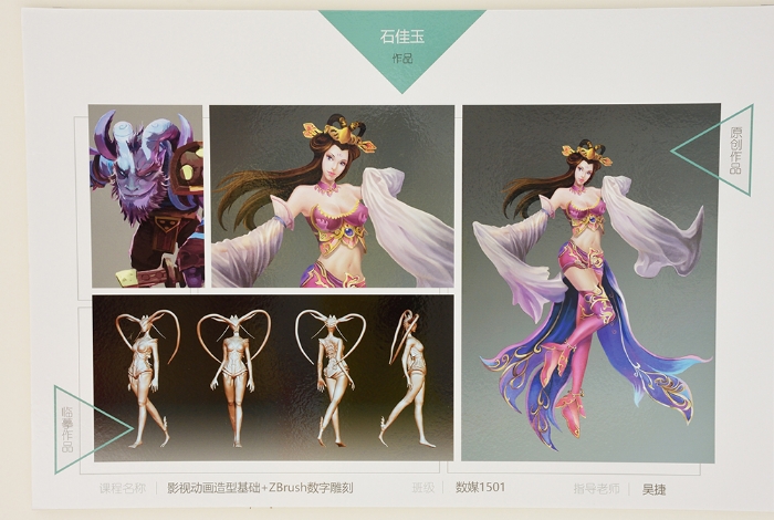 2015级数字媒体艺术专业学生从入学起,就在指导老师吴捷的带领下,学习了数字绘画和三维高模雕刻课程,在第一学年通过临摹和创意的调整,创作出了一批精美的设计作品。在一楼大厅展示的是数字媒体艺术专业共计38名学生的作品,每位学生的作品内容包括:影视动画造型、原画设计和三维高模雕刻。这些设计以影视特效模型和次世代游戏模型为基础,根据不同主题进行创作,其中以中国古典文化为主题的原画角色设计令人眼前一亮。围绕这个主题,学生结合了《封神榜》《西游记》和《红楼梦》等中国古典名著,运用了先进的CG绘画技术,将传统文化与数字媒体技术进行了创新结合,充分展现了数字媒体艺术专业高端的教学成果。