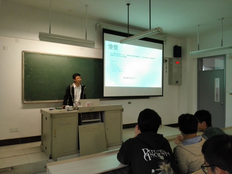 参加此次分享会的同学都以PPT的形式分享了他们大学两年的生活工作经历,大家都无一例外地提到了上了大学少了高中时候的那股拼劲,突然就变得“懒”了。同学们都对造成这种现象的原因分析了一下,并对剩下的两年大学生涯做了规划,争取找回曾经那个“巅峰”的自己。