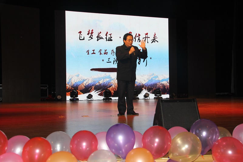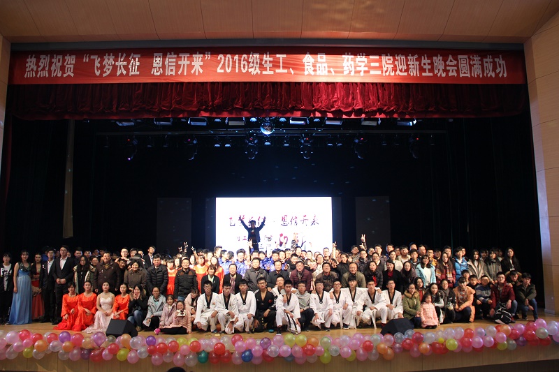 11月24日晚6:30, 生物与制药工程学院、食品与轻工学院、药学院“飞梦长征 恩信开来”2016年迎新晚会在江浦大礼堂顺利举行。校学生事务部副部长张涛、校团委副书记朱忠祥、生物与制药工程党委书记姜岷、院长韦萍、关工委常务副主任缪昌美、食品与轻工学院院长徐虹、药学院党委书记何冰芳、生物与制药工程学院党委副书记周辉、食品与轻工学院党委副书记陈晓晔、副院长熊强、药学院党委副书记张琪、三院辅导员、新生班级导师等和三院2016级新生共同观看了本场晚会。