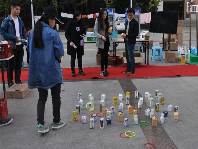 硕大的宣传牌立于沉毅广场中央,活动会场布置为U型。初入会场,是一个集赞推广活动摊点,只要将本活动分享至朋友圈或QQ空间,集满30个赞即可获得一瓶牛奶和5个套圈机会。同时,微信扫码关注卫岗牛奶公众号也可获得5个套圈,每人可领的套圈上限数为10个。第二个摊点是就业咨询点,主要介绍了卫岗乳业公司各部门职能,为有求职意向的同学们提供就职信息。第三个摊点是广告语、标语征集点,通过同学们的奇思妙想,各种新奇独特的标语也层出不穷。提供的标语一经采用,同学们将获得送奶上门一个月的大额奖励。最后可以去对面的摊点参加套圈活动,套中3个及以上不仅可以拿走套中的牛奶,还可以获得额外奖励。会场中心的企业文化竞答活动将活动气氛推向了高潮,大家根据自己的了解,踊跃回答问题,也对该公司的文化理念有了进一步的了解。
