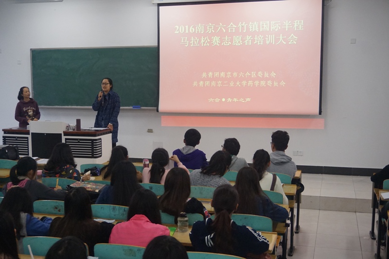 发扬志愿服务精神 传承志愿服务理念,普及马拉松赛事志愿者常识,提高马拉松志愿者的志愿服务能力,由校团委主办,六合团区委和药学院团委联合承办的南京竹镇国际马拉松志愿者培训大会于10月28日下午15:40在厚学302和厚学307举办。六合团区委副书记孙雨青老师,江苏省户外和运动协会副会长武玲玲老师,马拉松赛道主管余东明老师等参加了本次培训活动。本次培训会由药学院团委书记徐元龙老师主持,全院近200名志愿者参加了培训大会。
