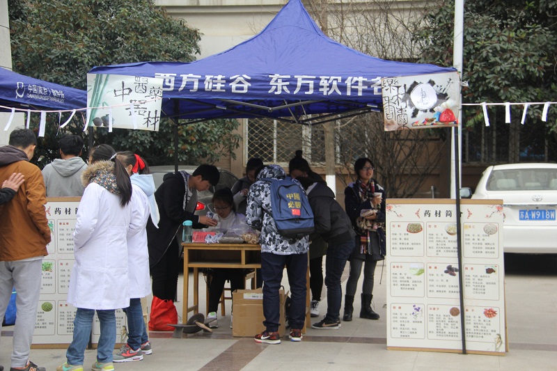 12月11日上午10点,生物与制药工程学院第八届中医药文化节活动在沉毅广场顺利举行。活动旨在弘扬中医药文化,关爱师生健康,普及中医药方面的知识。我校学生和南京中医药大学学生以义诊和现场体验的方式参与了活动。