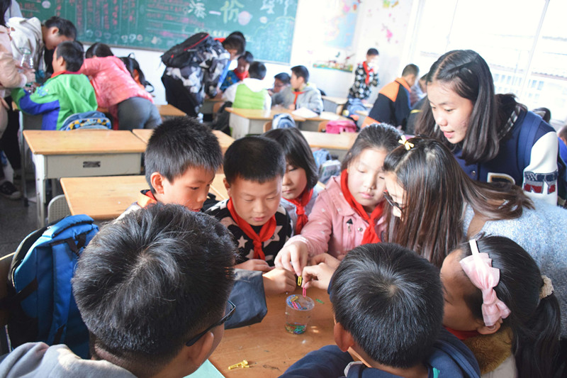 谁在小时不曾做过英雄梦?第一周来自办公室和团总支的志愿者们为小学生们普及团知识,小学生们对于共青团鲜活而又纯粹的向往,正是源自课本里那些勇敢有担当的少年英雄。科协与办公室的志愿者在第二次活动中带着小朋友们共同领略科学实验的神奇,面对烧不烂的纸巾与溢不出纸杯的水,小孩子们灵动的想法充满了创造力;动手实践时,各小组成员互相合作也十分积极。第三次的活动恰逢“长征五号”成功上天,伙同新宣的成员,带领小学生创作泥塑火箭,不起眼的“小火箭”里蕴藏着自豪感与对祖国的期许与祝愿。第四周,在文体中心同学们的助阵下,一个神秘的小魔术,一场美妙的吉他曲,大学生和小学生一起唱响“童年”,遇见“夜空中最亮的星”,青年与儿童,不知是谁抚慰了谁?第五周,创知、外联、办公室三者联手,乘着成语的小舟,与小学生们共渡那波光潋滟的国学,趣味无穷的成语课堂上,孩子们的认真令人难忘。