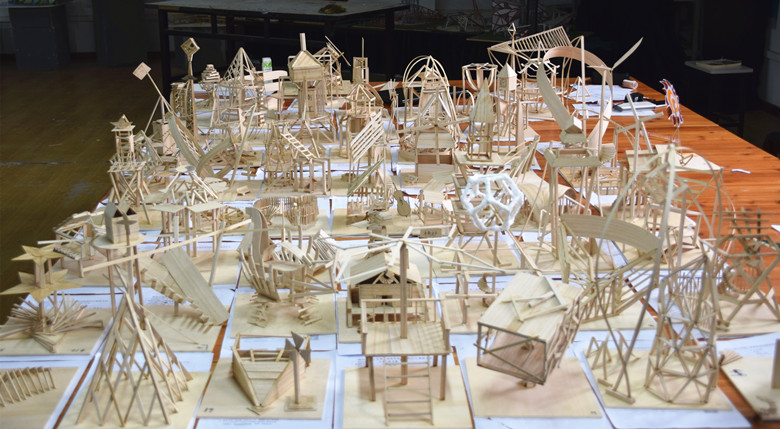上午8:30,参赛选手陆续来到创新基地,望着满桌工具跃跃欲试,摩拳擦掌。在主持人介绍完比赛规则和材料后,比赛正式开始。选手们经过短时间的讨论,立刻进入紧张的制作环节。各组成员都认真地为自己的小建筑构筑一砖一瓦,每一根木条的架构、每一块木板的运用,都力求将自己的构思在有限的材料中发挥到淋漓尽致。经过三个小时的紧张制作,一件件造型巧妙的作品展现在大家眼前。