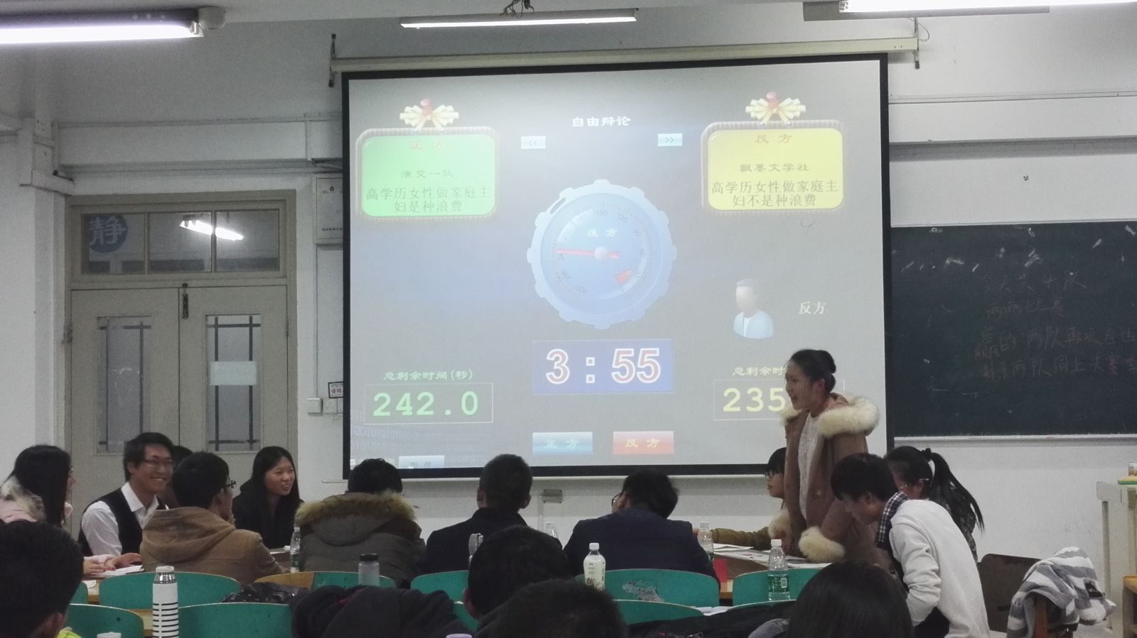第二场比赛紧接着拉开了序幕,此场比赛辩题为是高学历女性做家庭主妇是否是种浪费,正方为演交协会一队,反方为飘墨文学社。在比赛中,双方辩手均列举了大量权威数据和事实证据,据理力争,试图让自己的观点占上风。场内气氛热烈,情势紧张,辩手们妙语连珠,观众提问环节更是积极活跃。评委对此次比赛做出了总结,主持人宣布飘墨文学社获胜。