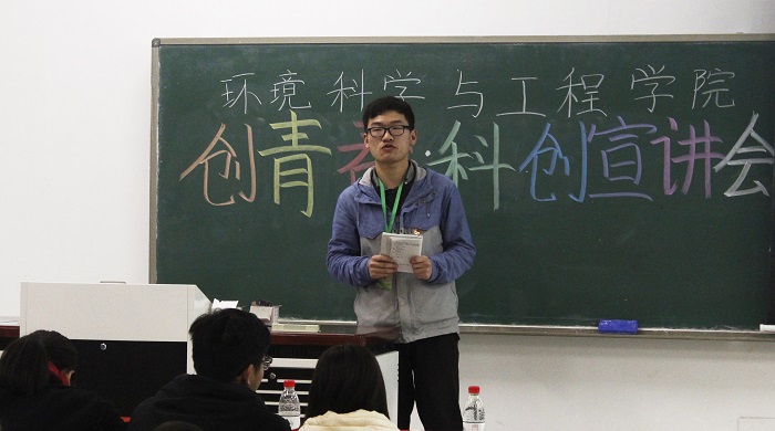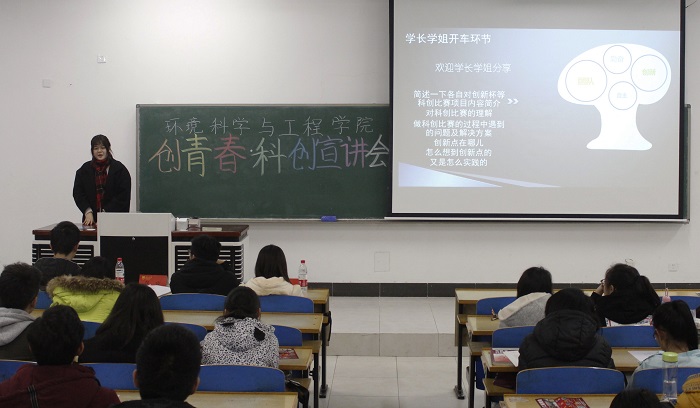 为深入实施“创新攀登”工程,贯彻落实创新精神,增强学生对科创类比赛的认识,提高学生参加科创比赛的积极性,环境科学与工程学院学生联合会竞赛部在3月24日晚六点于厚学楼202室举办了“创青春·科创宣讲会”活动。本次宣讲会由竞赛部部长池港主持。