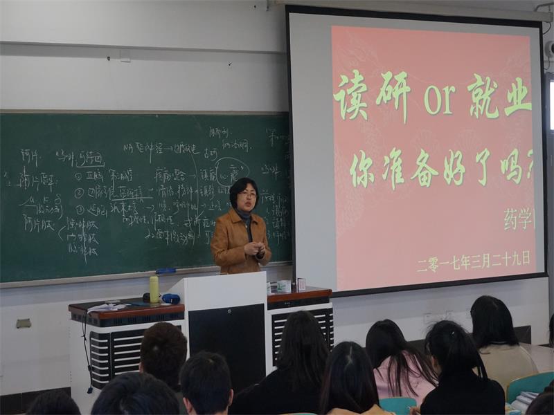 为帮助2018届毕业生更好地认清自我,理清职业规划思路,找准人生定位,促进学生就业质量提高。3月29日下午15点,药学院党委副书记张琪老师在厚学309作了一场题为《就业or考研——向左向右更向前》的讲座,为广大学子释疑解惑。