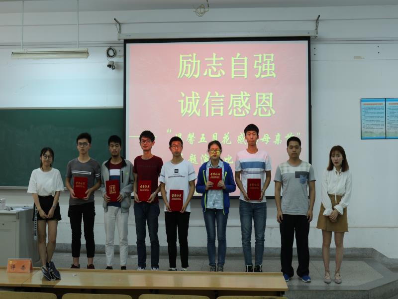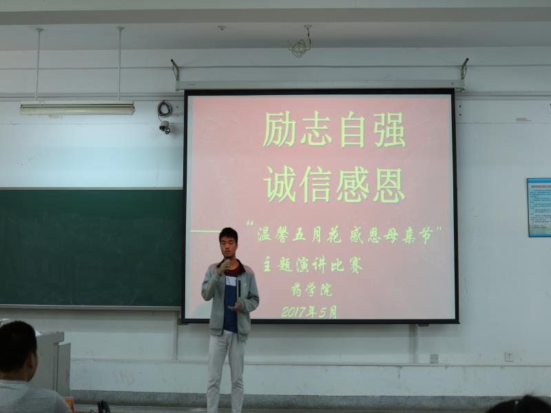 为更好的配合学院正在开展的资助诚信教育主题活动,药学院在2017年5月12日开展了“励志自强,诚信感恩”母亲节特别活动,以演讲比赛的形式,表达了自己对于自己母亲,以及祖国母亲的感恩之心。助理班主任担任本次活动的评委。