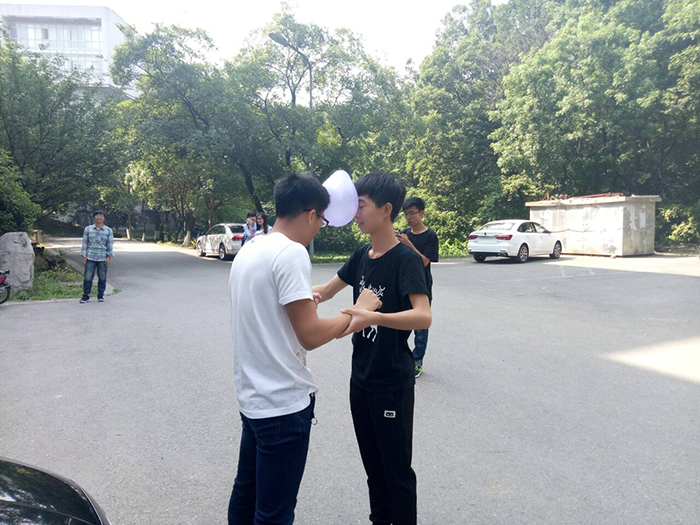 到这里,实验室内的活动已经全部完成,全体同学到室外进行最后一项互动环节:多人游戏“头顶气球”。每组3位同学,每次由任意两位同学头夹气球走过一段固定路程,在1分钟内走的次数最多的一组获胜。参赛的共有5个小组,每个小组的同学都竭尽所能,现场气氛紧张又欢乐,经过激烈的角逐,最终来自外语学院的一组同学以1分钟内走过9次的成绩夺得冠军,并获得了精美奖品。