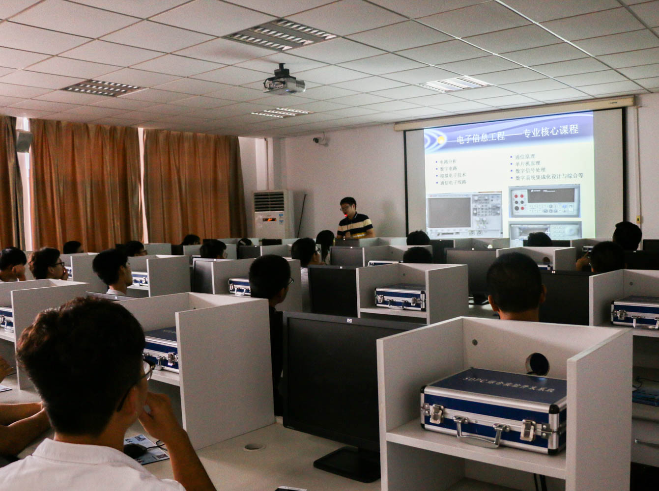 学籍教育结束后,全体新生前往学科楼的实验中心进行参观。郁剑老师针对电子信息工程的核心课程向同学们进行了系统的讲解。