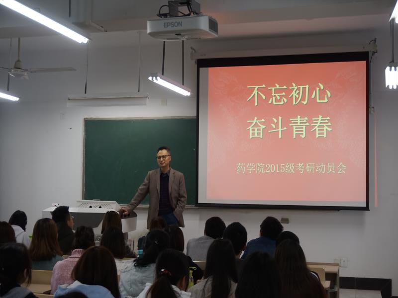 为了激发同学们的学习热情,为接下来的大学生活树立明确的目标,充分调动同学们考研的积极性,药学院于11月2日下午15:30在厚学205教室举办了“不忘初心,奋斗青春”教授励志报告会。本次报告邀请到学院退休教授王伯涛老师主讲,学生事务办公室主任徐元龙老师主持,药学院全体2015级同学参加。