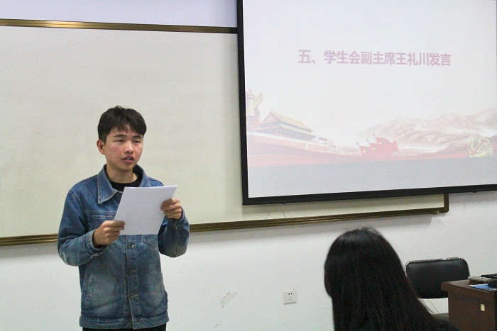 与会同学认真阅读十九大报告,并随即开展了热烈的讨论。工管1703班长冯文昊同学作为班委代表发言,他认为作为一个班长,必须要以服务班级全体同学为工作落脚点,同时不忘时代赋予青年的责任。外联部部长应园洁同学作为学生会部长团代表发言,“来源于学生,服务于学生”是学生会开展工作的宗旨,同时也要在时代的背景下开展工作。副主席王礼川同学作为学生会主席团代表发言,他表示我们这代青年非常幸运,将会全过程参与实现“两个一百年”奋斗目标。一代青年有一代青年的历史机遇,当代青年一定要把个人的成长和国家的发展联系起来,展现出自身的责任与担当。