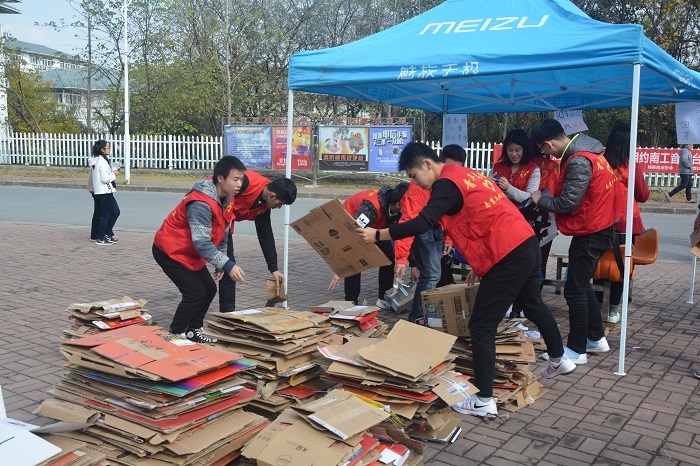 继双十一购物热潮后,我校校园内快递数量陡增,拆解后成堆如山的快递盒给校园卫生保洁带来了巨大的压力。根据校园现状,环境科学与工程学院与其他四个学院共同策划了此次活动。本次活动于2017年11月20日中午十二点和晚上五点半在亚青宿舍区开展,面向万博体育bet 全体在校学生统一回收废弃快递盒。