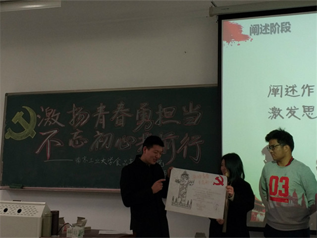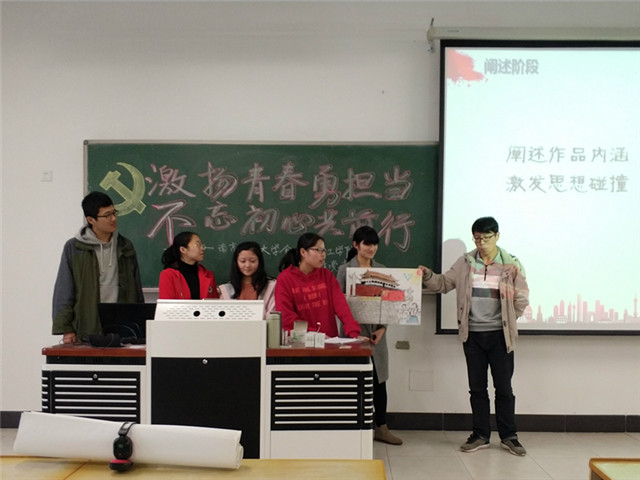 首先由黄政瑜对活动主题进行简要的解说。之后以党员2人、非党员2-4人一组的形式,围绕“激扬青春勇担当,不忘初心共前行”主题进行发散性思维的绘画或者手抄报。张晨怡和蒲雅婕小组通过绘画来诠释“青春的风浪”,以此来表达自己正值青春,应当勇于担当,发挥才干。吴天祺与陈心怡小组则绘出一张手抄报,以此来展示习近平总书记关于青春、关于初心的重要讲话。谷世明和朱银洁小组联系华表的图文构型及其内涵对“不忘初心”进行了解读,张晓康和吴越琪小组也展示了他们心目中的十九大与我们的活动主题,强调了绿水青山的重要性,其余小组也对自己的作品进行了解说。最后黄政瑜同志对本次活动做了点评总结,认为各组作品主题鲜明有内涵,想象力非常丰富,希望大家能从中学习,加强对党的认识,将“激扬青春勇担当,不忘初心共前进”变成心目中的指路标。