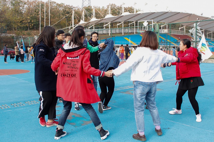 寒潮来袭,早晨的气温只有零上三四度,但各小组早早就准备就绪了。大家被分成八个小组,每个小组由组长领队。热身运动后,很快便进入到了第一个游戏。