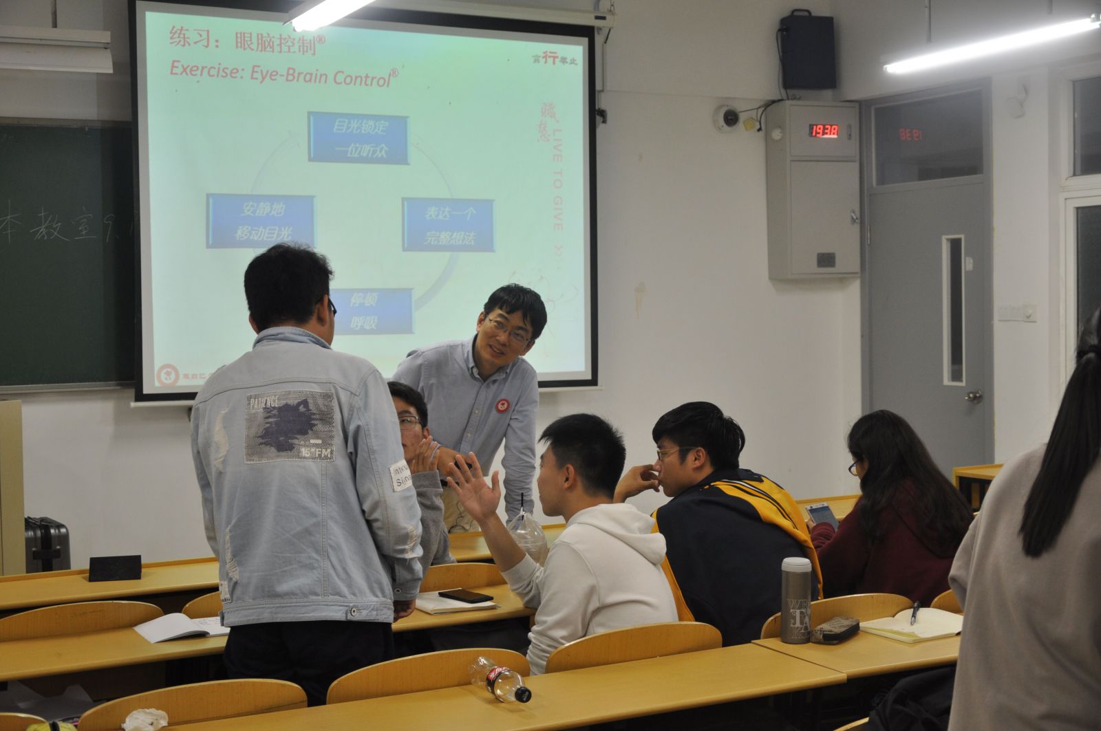 讲座现场氛围热烈,17级的班干部们在厚学楼410教室与梁老师进行了积极的互动。梁老师根据当代大学生的实际情况,从“言”、“行”、“举”、“止”四个方面告诉我们如何进行一次有价值的演讲。在“言”这个方面,梁老师讲解了“引起注意,阐明论点,提供论据,重述论点”这四个步骤,并让同学依次练习即兴发言;“行”和“举”这两个方面,梁老师分别强调了眼脑控制和肢体语言的得体;在“止”这个方面,梁老师分析了停顿的重要性。整个讲座中,梁旻老师的个人魅力深深地折服了在场的每位同学。