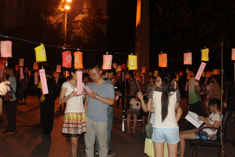 在下午的药学开放周启动仪式活动结束后,灯谜晚会随后拉开序幕。沉毅广场外高高挂起了数个大红灯笼,活动现场内悬挂了上百个小灯笼,每个灯笼下有一个灯谜。同学们走入灯谜区域,看灯答题,谜面涉及医药、健康、成语、动植物、中草药等题材,激起了参与者强烈的答题兴趣。首先由参与者自由走动答题,每答一道题,就将悬挂的灯谜撕下,若答对则去各个区域的负责人那盖一枚印章。广场上,同学们三三两两,聚在一起,或低头沉思,或热烈讨论,尽力解答灯谜。在他们展现个人智慧的同时,增进了对中国传统文化的认识,也提高大家对医药与健康的基本认识。天渐渐暗下来之时,灯笼内的灯逐渐亮起,参与的路人也越来越多,将整个晚会推向高潮。经过了两个半小时的激烈答题,同学们积累的印章也越来越多,并根据印章的数量换取了相应的奖品。晚会结束后,学生会全体工作人员不辞劳苦,及时将活动现场清理干净,保证第二天沉毅广场正常使用。