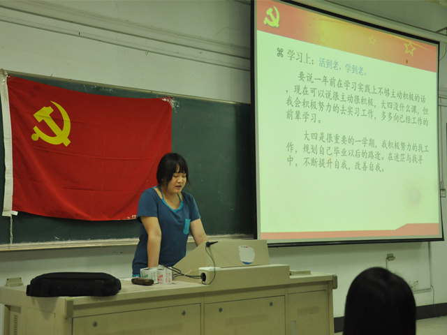 晚上6:00整,会议准时开始。9位预备党员经过抽签后依次上台进行他们的转正PPT展示。PPT的内容大致包含了9位预备党员在一年预备期间对于入党之初群众向其提出的个人不足的认识和改进、预备期前后的对比、以及在其学习、生活、工作等方面的进步。PPT展示的最后,他们也都向党组织表明了早日成为一名中共正式党员的决心。PPT展示后即进入答辩环节,该环节分为简答题、论述题及时事材料分析三个部分。在简答和论述环节,9位预备党员会前准备充分,对评委团所提出的有关党的理论知识的问题应答如流,论述时也都侃侃而谈,各有见地。时事材料分析涉及社会、经济等方面,9位预备党员也都能透过材料事件结合所学理论知识和时下改革动向进行分析,使台下观众受益匪浅。