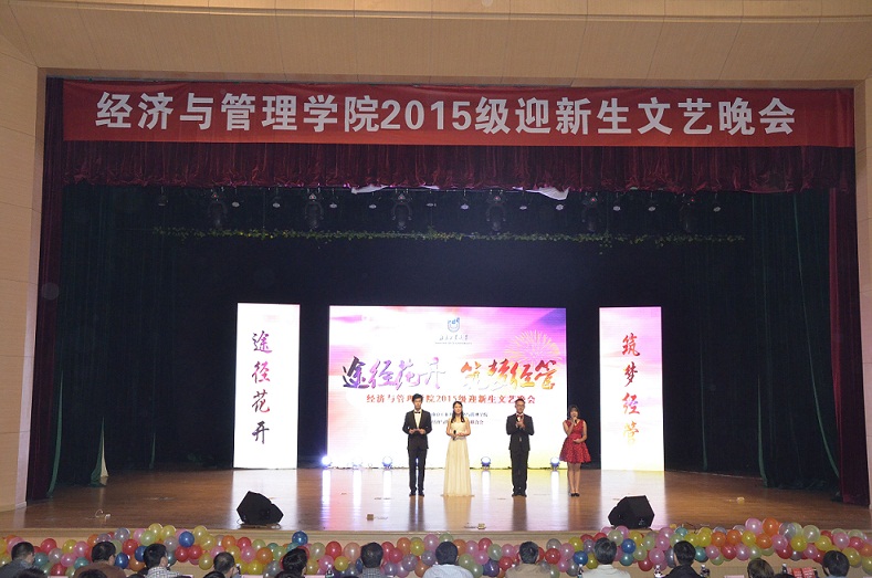 大雨挡不住激情飞扬,青春诠释着希望梦想。10月26日晚,经济与管理学院2015级迎新生文艺晚会在江浦大礼堂隆重举行。经济与管理学院党委书记林锦国、院长赵顺龙、副院长杨同宇、副院长钱存华、副院长陈同扬、党委副书记刘涛、各系中心主任、部分教师代表、全体辅导员以及学院全体2015级本科生、研究生、留学生观看了晚会。