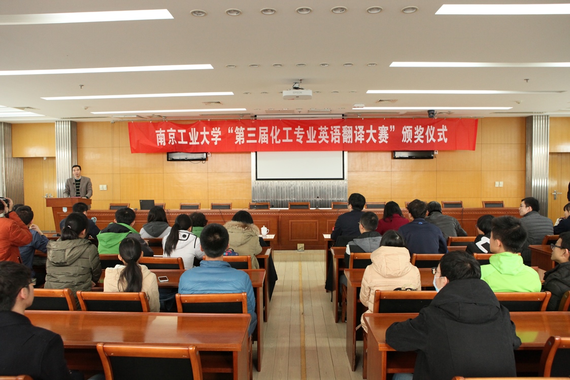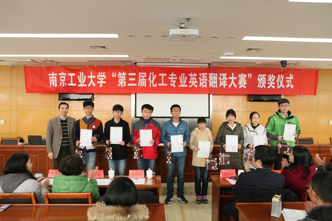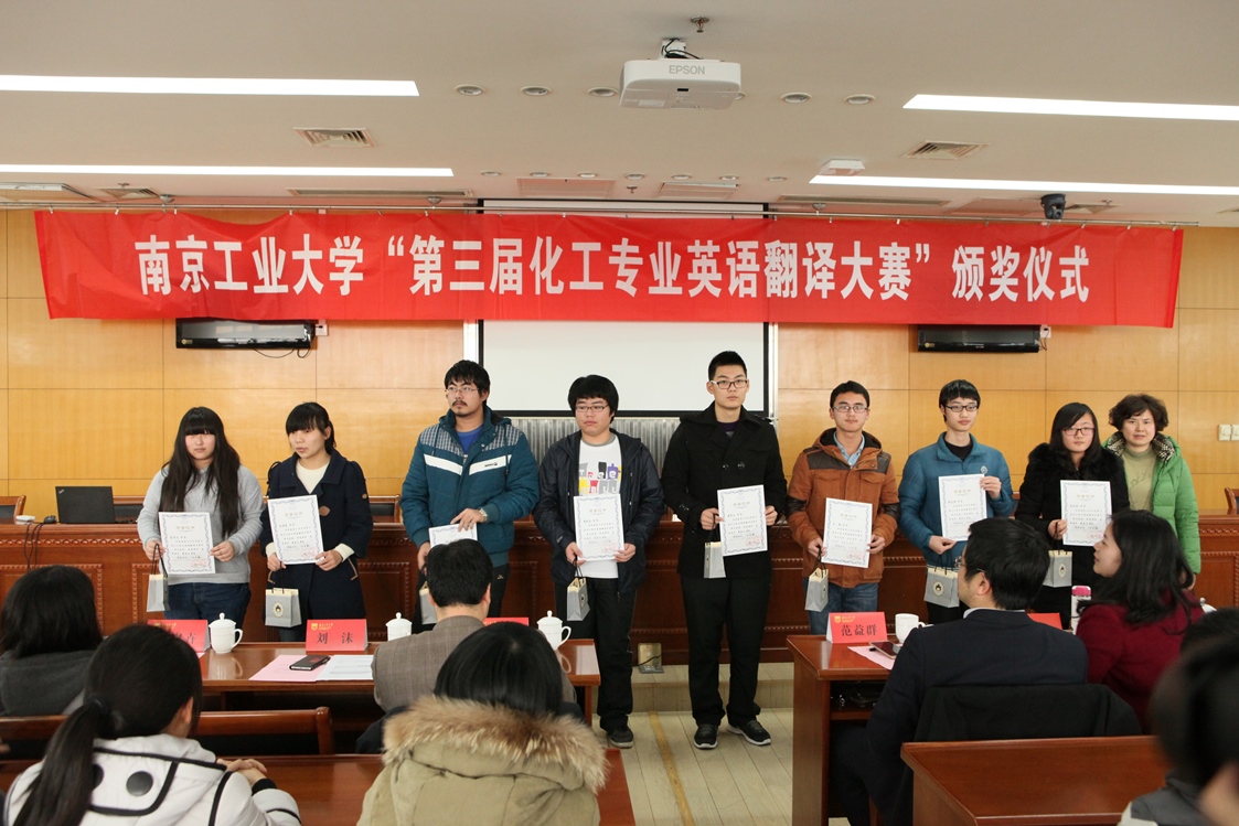 为了帮助大一新生尽早了解所学专业,树立明确的学习目标,化工学院主办连续三年举办化工专业英语翻译大赛,化工学院和2011学院全体大一学生参加了该项比赛。2015年1月6日下午,第三届翻译大赛颁奖典礼在逸夫图书馆五楼报告厅隆重举行,化工学院院长范益群教授,2011学院党总支书记眭国荣教授、副院长刘沫老师,化工学院党委副书记弋鹏老师,2011学院学业导师谷和平教授,2011学院辅导员朱书卉老师,化工学院辅导员王郁超老师和陈献富博士出席活动。