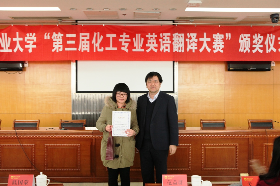 随后,2011学院党总支书记眭国荣教授宣读了获奖名单,各位嘉宾老师为获奖同学颁奖。此次翻译大赛两个学院15级共293名新生参与,其中有49名同学获奖。化工1508班冷柏丹同学作为唯一的特等奖获得者上台发言,她分享了参加翻译大赛在英语学习和文学知识运用方面的收获,并通过翻译前沿化工行业进展的材料,坚定了学习化工专业的信心。