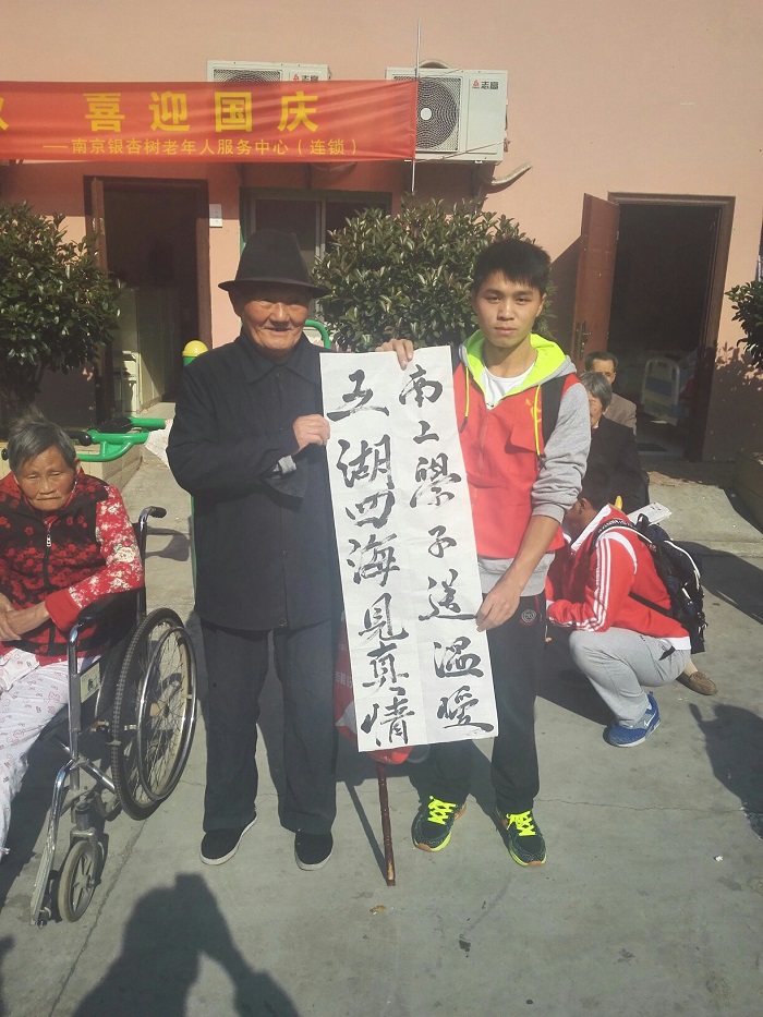 活动伊始,班级团支书陈雨薇向敬老院负责人和老人们表明了来意,简单地介绍了班级为老人们精心准备的节目,同时同学们小心地推着轮椅搀扶老人到太阳下休息并欣赏节目,老人们看到这些充满活力的年轻人也是非常开心。首先给老人表演的是校十佳歌手汪孙儒同学,他用一首气势恢宏的军歌感染了在座的每一位饱经沧桑的老人。与此同时,其他同学在与老人亲切地攀谈着。诉说与倾听,本就是世间最美丽的组合,同学们也在一次次的交谈中认识到了老人们的生活状态。汪孙儒同学的表演刚刚结束,表演书法的杨兴坤便早早做好了准备。当书法表演进行的如火如荼时,一位退休多年的老教师大方地展示了自己的墨宝助兴,最后更是与杨同学合作一幅“南工学子送温暖,五湖四海见真情”送给银杏树养老院。