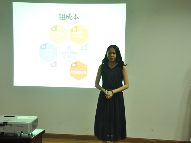 本次活动首先由主持人宣布比赛开始,紧接着“乐show研发团队”、“膜力公司”、“南工氯扬创新团队”、“聚爱团队”四组参赛团队依次展示了自己的作品,并向评委老师详细解说了自己产品和初赛相比有何改进。其中“乐show研发团队”引用“女神与女汉子”的节奏感,将比赛推向了高潮。而“膜力公司”是以一种创造性思维介绍了一种具有广阔发展前景的膜类。相比之前的团队,“南工氯扬创新团队”则是以“投资”的新颖形式向评委老师展示了他们的产品。最后“聚爱团队”以“颁奖”的形式,华美的服装,独特的创意,给本次活动画上了一个完美的句号。虽然四组团队各有所长,实力不相上下,但是比赛总会有淘汰。最终经过两位评委老师的深思熟虑,“乐show研发团队”和“南工氯扬创新团队”成功晋级决赛。在陈晓晔老师做活动结束致词之后,主持人宣布本次活动结束。