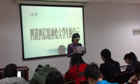 盛文娟同学满怀激情地阐述了开展学习宣传贯彻习近平总书记系列重要讲话精神“四进四信”活动的重要意义,即以“四进”为手段,以“四信”为目标,通过“进支部、进社团、进网络、进团课”,组织开展有形化、经常化的工作和活动,引导帮助广大青年学生和我院团干部进一步牢固树立对党的科学理论信仰、坚定走中国特色社会主义道路实现“中国梦”的信念、增强对党和政府的信任、增进对以习近平同志为总书记的党中央的信赖。参加交流的成员分成了四个小组,并分别以书面交流,幻灯片展示,学习心得演讲,现场问答等形式学习交流习近平总书记系列重要讲话精神。生工学院学生会主席陆歆毓、李京宸、叶建朋分别结合自身实际阐述了自己对于“四进四信”的理解,让大家学会了如何从实际贯彻实施“四进四信”活动。
