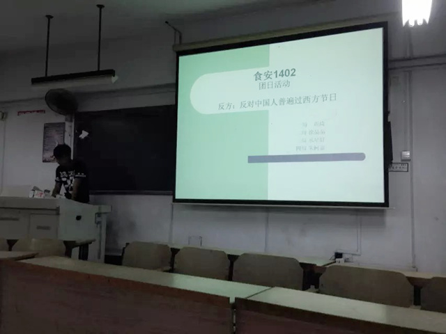 为响应“五四”青年节的号召,结合当下西方节日在我国大受欢迎的时代背景,5月24日,食安1402班就“当代国人是否应该普遍庆祝西方节日”这一论题开展了团日活动辩论赛。此次团日活动特邀食安1402班助理班主任张娇、13级团总支书记侯甲第、13级团总支书记助理秦红叶、轻化1402班团支书杨文以及食安1401班团支书王颖担任嘉宾评委,由食安1401班组织委员张丽娜同学担任辩论赛主席。