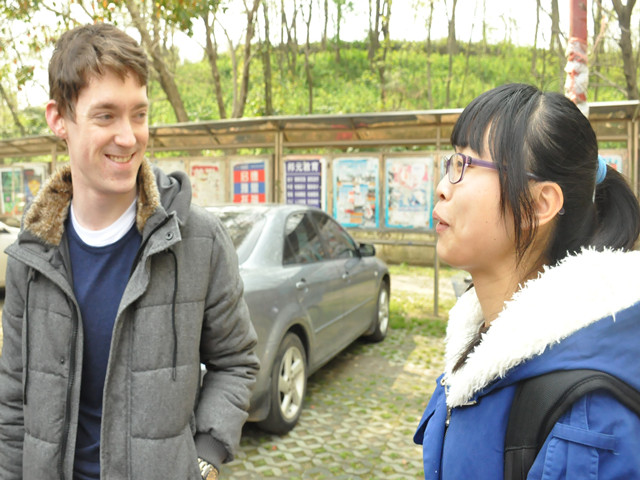 伴随着温暖惬意的阳光,在团支书同学一段简短的开场白后,团日活动正式开始。同学们3-5人自由组合进行采访调查,就雷锋精神、身边雷锋和对雷锋精神的想法等问题采访过路的老师、同学及学校工作人员;其中路过的一位外国朋友也接受了采访,但遗憾的是他并不知道雷锋。同学们热情地向他介绍雷锋及其事迹,一番热谈后,外国朋友学习用中文说出了“学习雷锋好榜样”七个字。