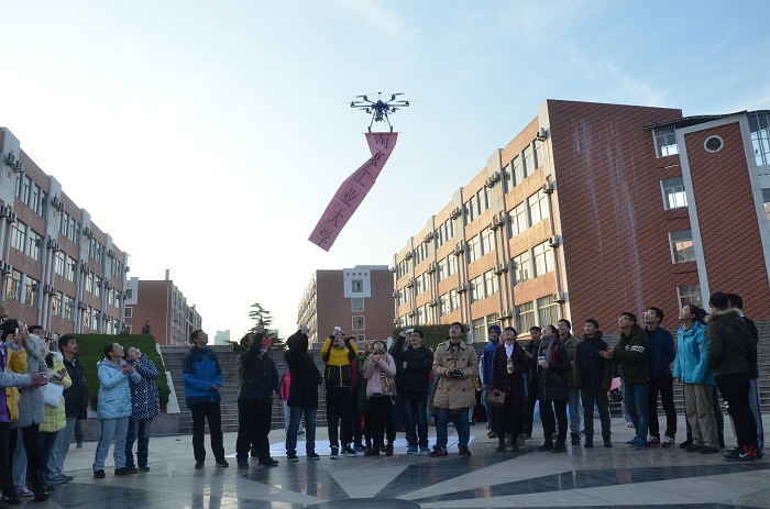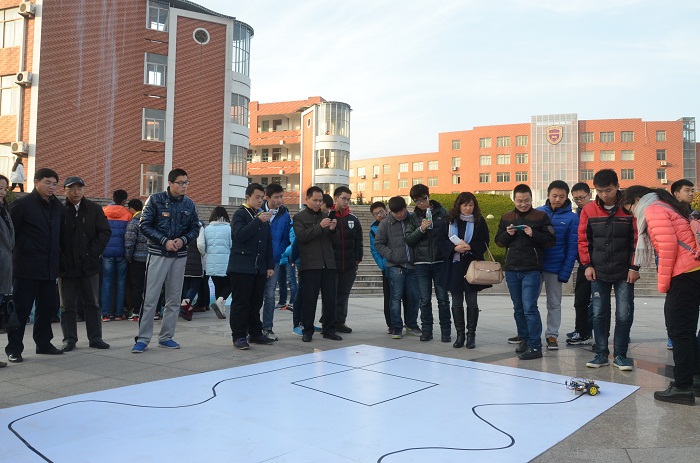 在展示的同时,南工学子们一直耐心地解答着同学们各式各样的问题,同学们聚精会神地看着3D打印机一点一点慢慢成型,那是同学们闪耀的智慧在结晶;循迹小车缓缓在白板上走出的那条黑色轨迹,那是同学们追逐科技梦想的道路在前方。当六轴飞行器高高飞过新海“凌云”教学楼时,悬挂着“万博体育bet ”字幅飞起的那一刻,南工学子的骄傲,也感染了新海中学的每一位同学。